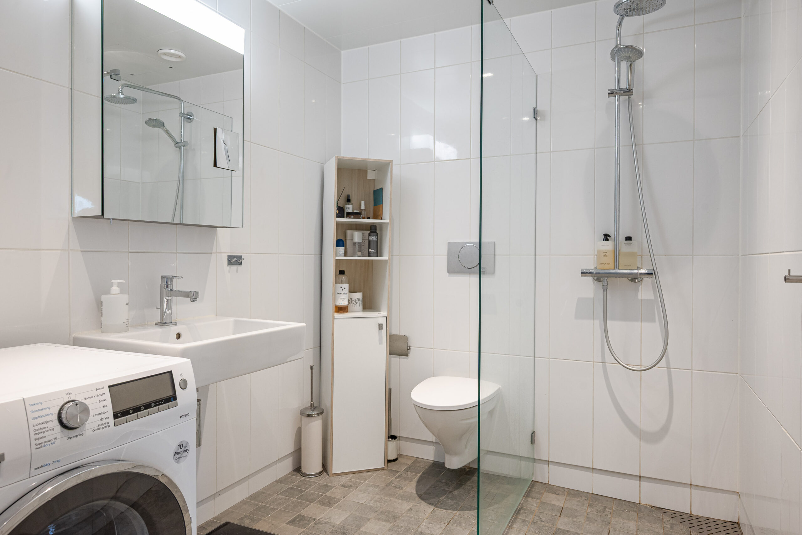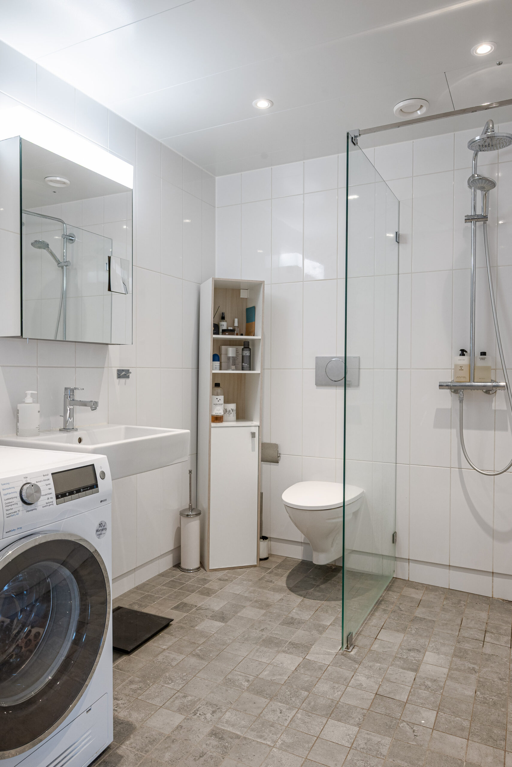 Badrum med gott om plats, här finns ten kombi tvättmaskin/torktumlare, vägghängd WC, handfat och dusch. Golvvärme och spotlights.