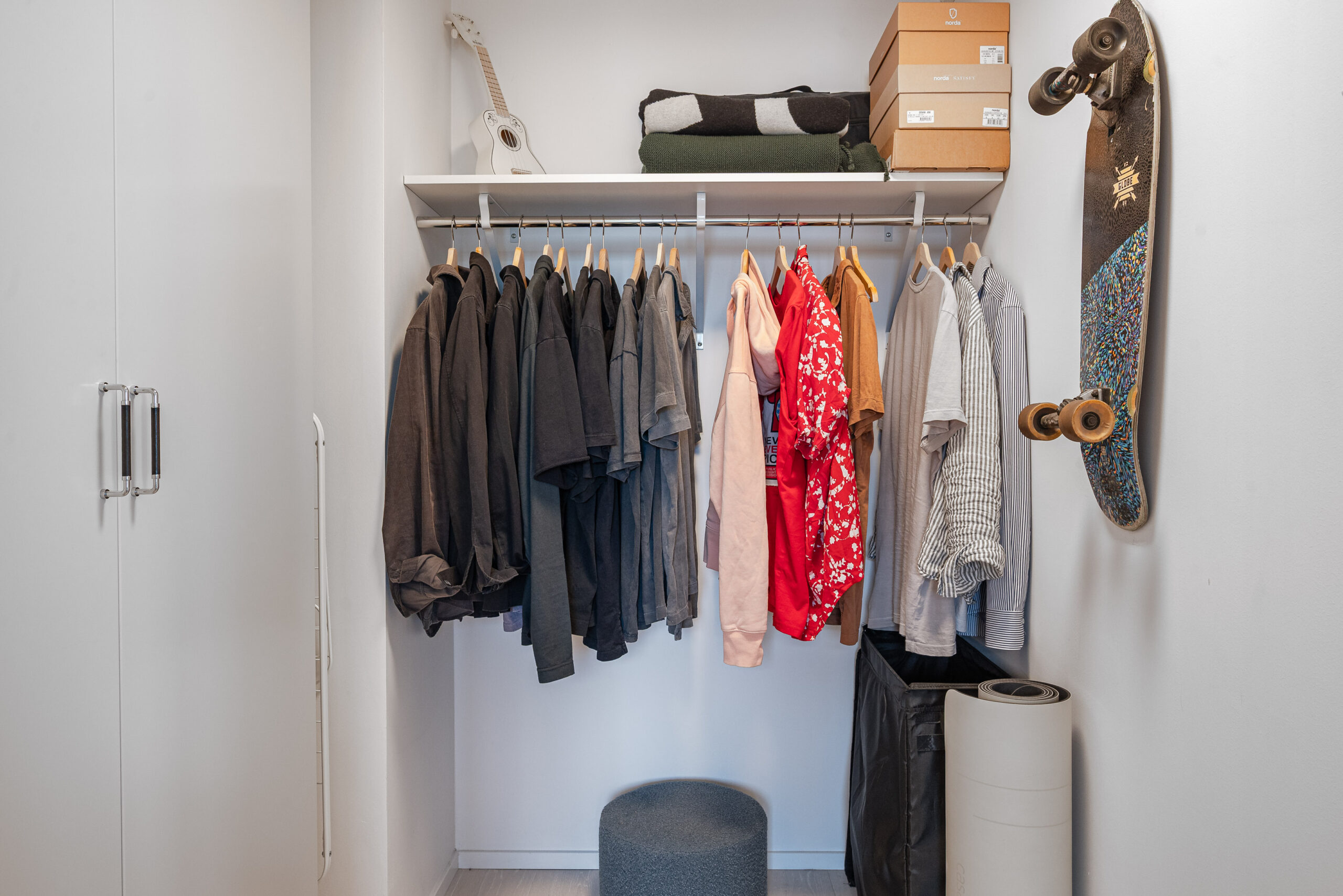 Stort sovrum med en walk-in closet intill plus två garderober och hyllor.