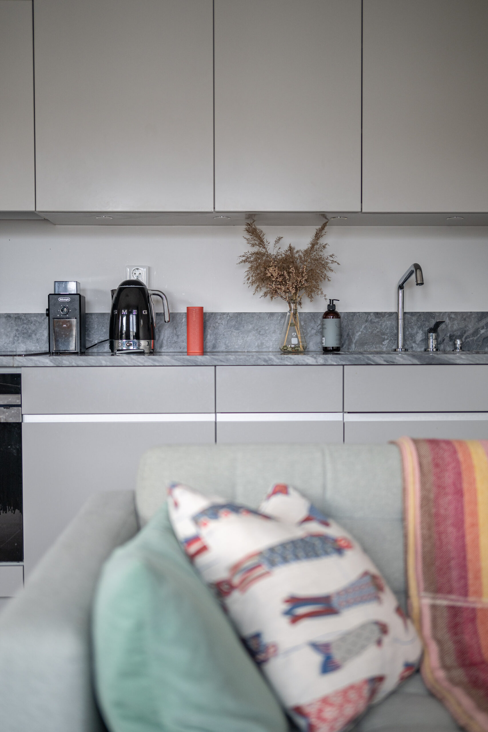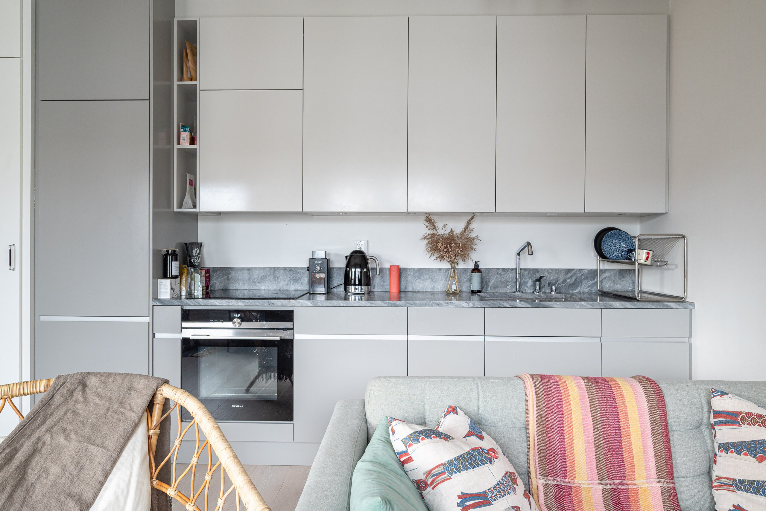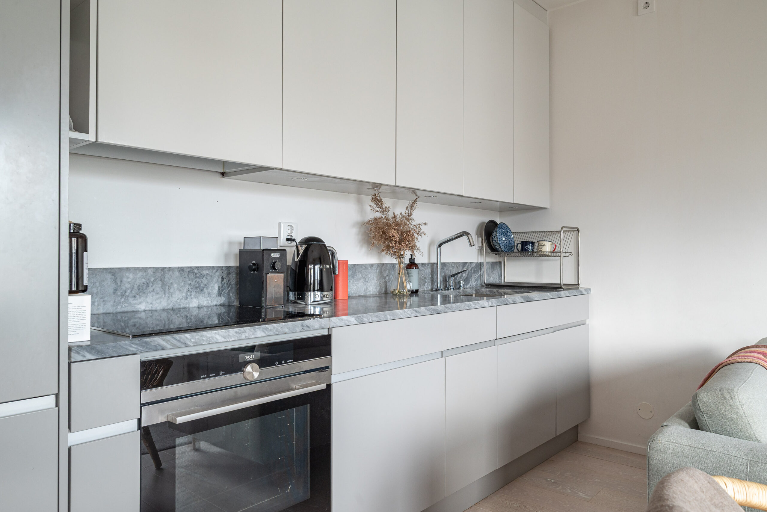 Köket är välutrustat med utvalda material. Köksbänk av sten med gott om arbetsyta, induktionshäll, ugn, fläkt, integrerad diskmaskin och kyl- & frys.