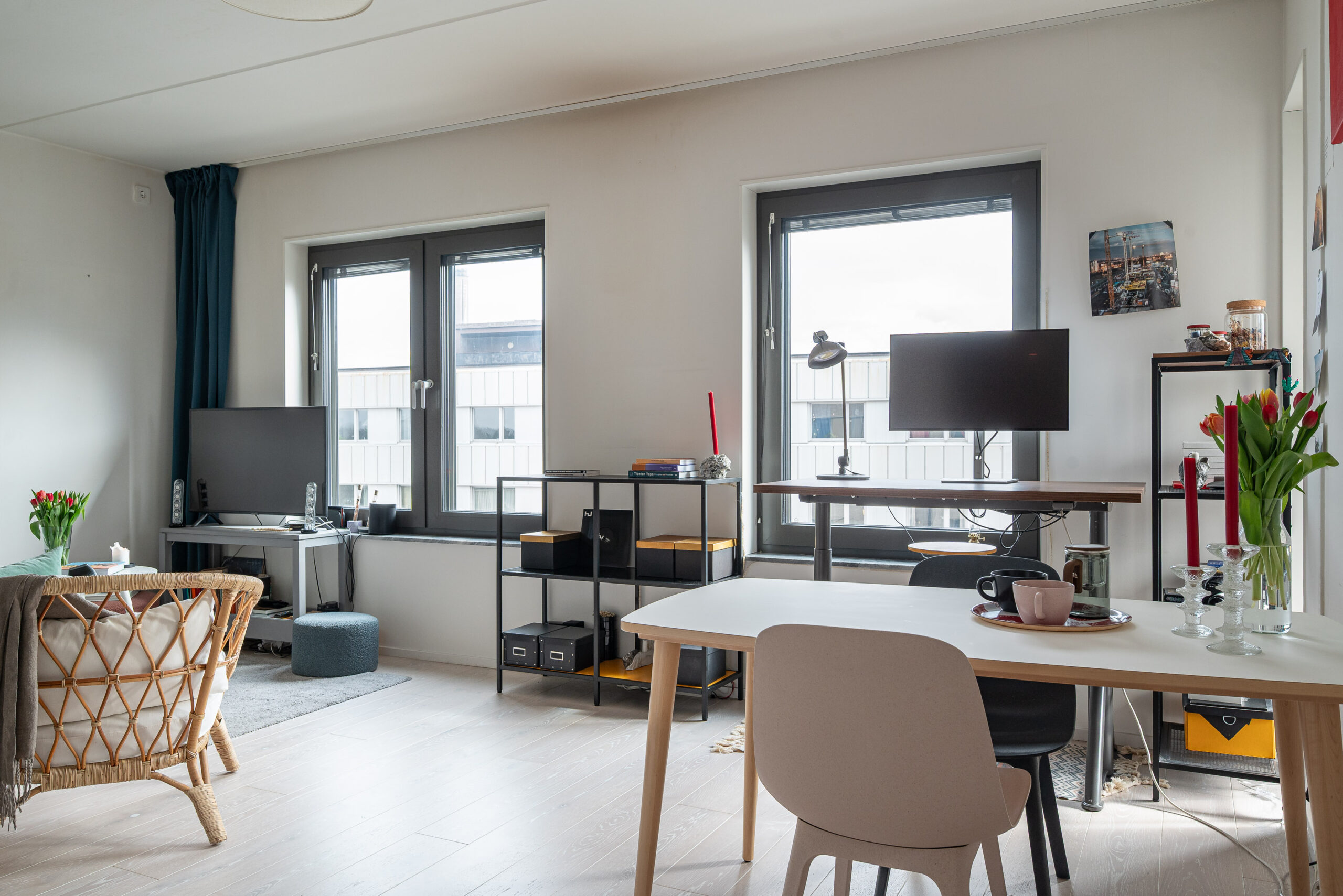 Rummet upplevs rymligt med en generös takhöjd om 2,60 m och stora fönsterpartier.