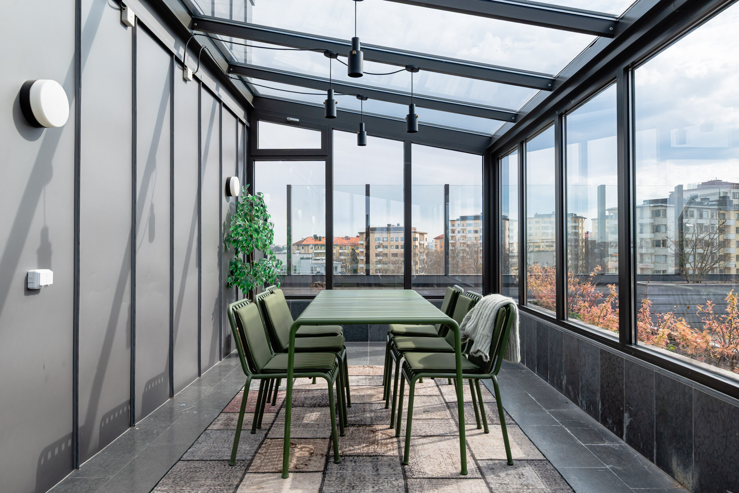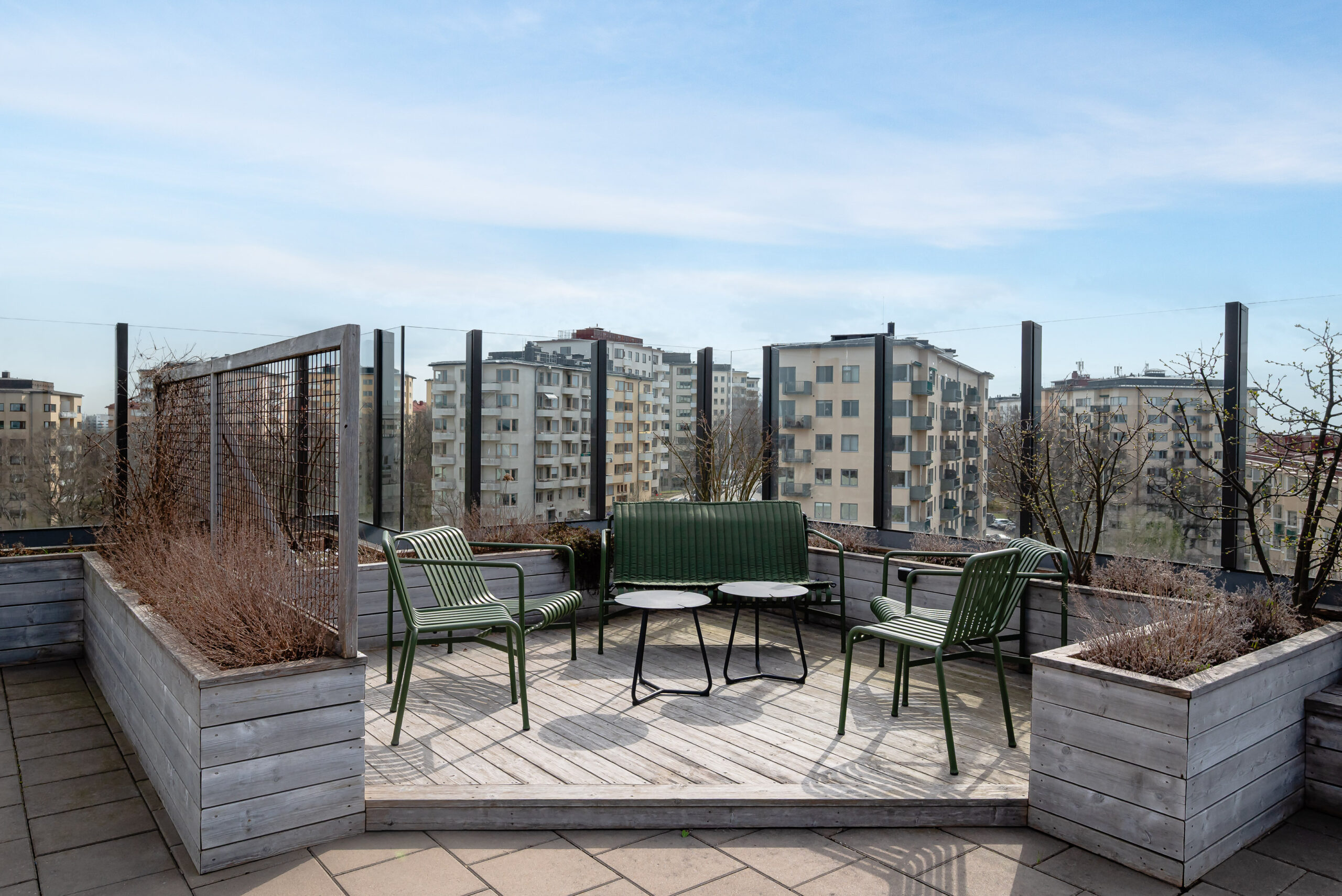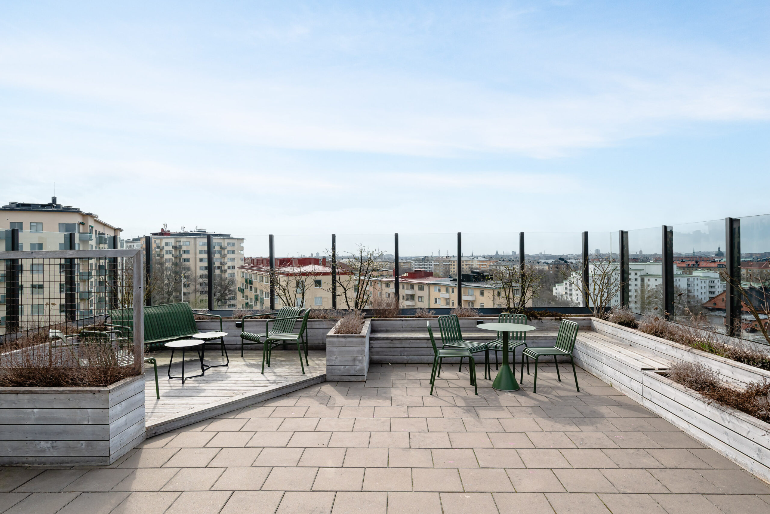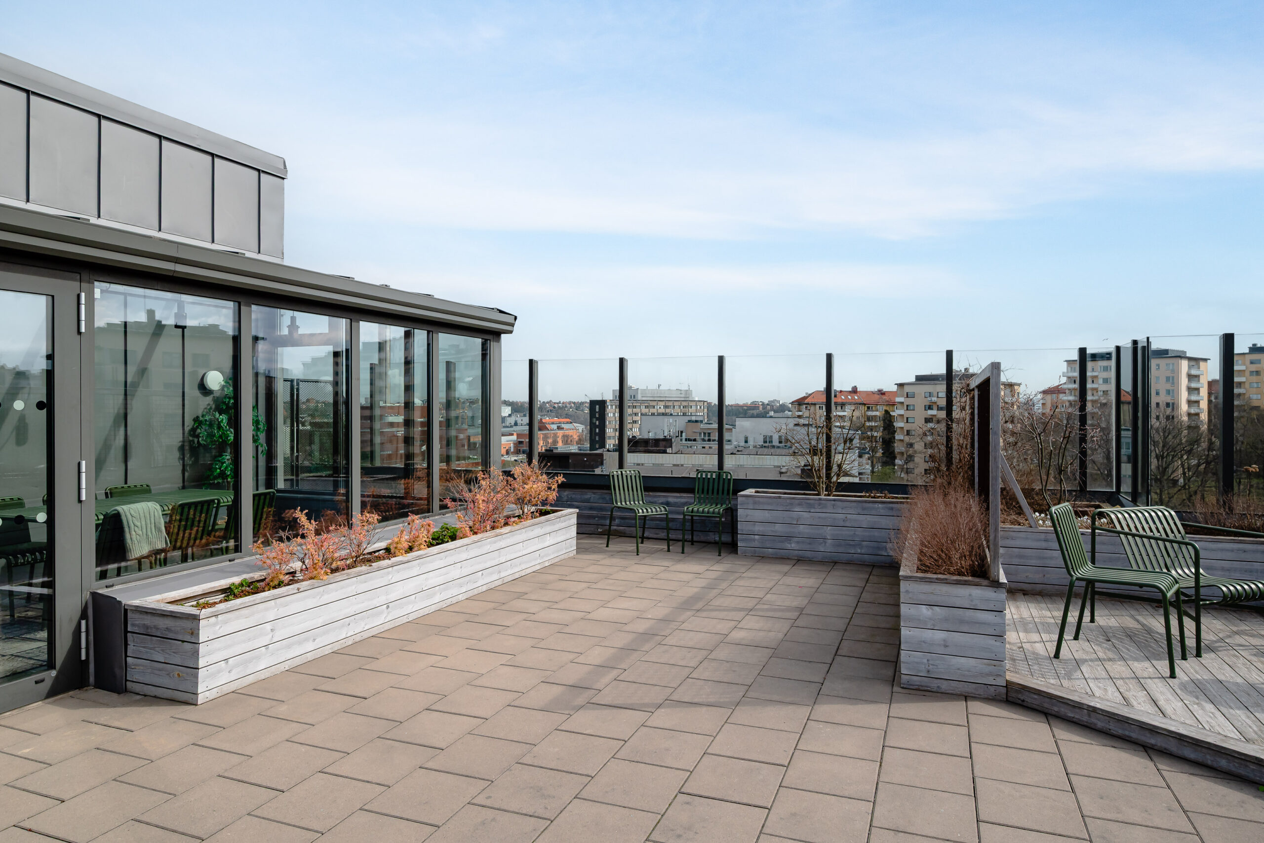 Den gemensamma takterrassen har panoramautsikt över hela Stockholm och det finns även ett orangeri för odling av kökskryddor eller annat. Orangeriet förlänger tiden för nyttjande av terrassen, allt från lugna sköna stunder till fest.